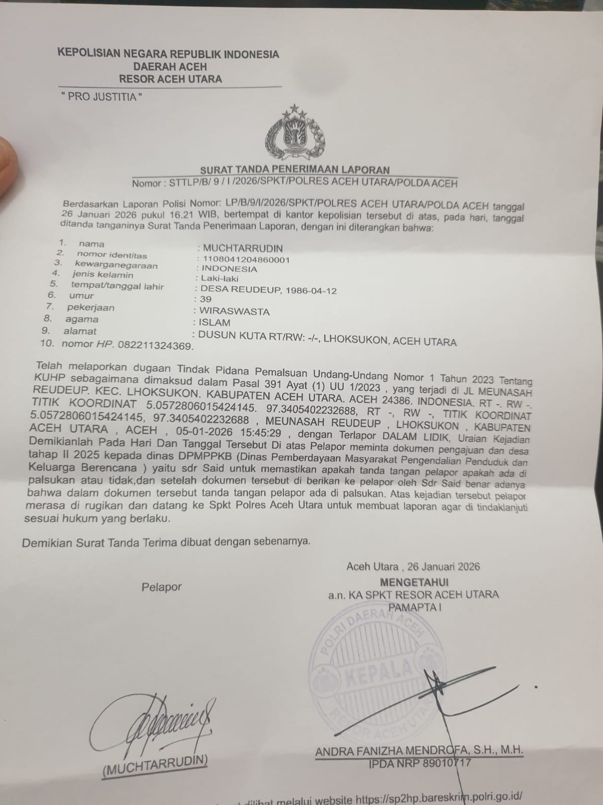 Aceh Utara, ( DERAP KEADILAN.COM ) 26 Januari 2026 – Mantan Geuchik, Tgk. Muchtarrudin (39), melaporkan dugaan pemalsuan dokumen yang merugikan dirinya ke Satuan Polisi Khusus Tindak Pidana (SPKT) Polres Aceh Utara. Laporan resmi tersebut tercatat dengan nomor STTLP/B/9/I/2026/SPKT/POLRES ACEH UTARA/POLDA ACEH dan langsung diterima pada hari yang sama.