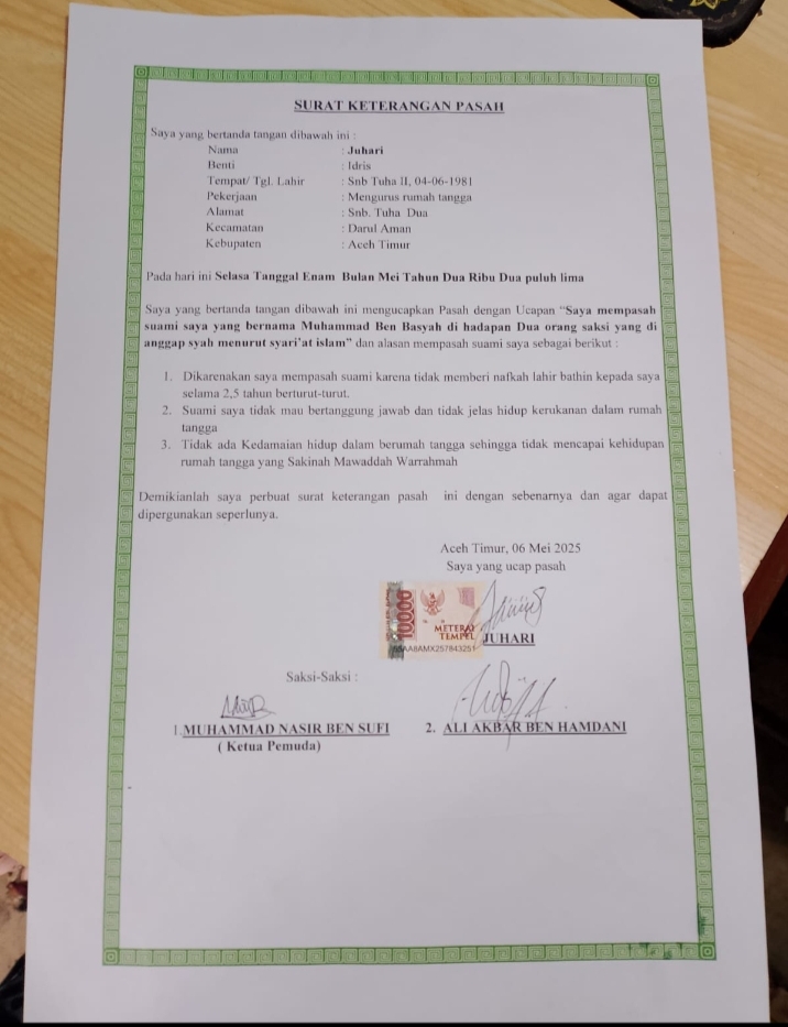 aceh timur ( DERAP KEADILAN.COM ) , 13 maret 2026 – RB, suami sah juhari binti iddris dari desa seuneubok tuha dua, kecamatan darul aman, kabupaten aceh timur, menegaskan akan melaporkan secara resmi dua orang yang diduga terlibat dalam pembuatan dan penggunaan surat pasah palsu untuk memperkenalkan perkawinan baru juhari di kawasan bireuen.