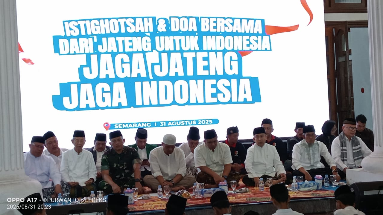 Kota Semarang, Jawa tengah – Minggu 31-Agustus-2025 pukul 19.30 s/d 22.30 WIB tempat di wisma perdamaian, disambut gubernur Jawa tengah dan wakilnya, TNI-POLRI, dihadiri para tokoh sesepuh Jawa tengah dan lintas agama, aktivis ormas LSM se-Jawa Tengah rawuh dari NU, Muhammadiyah, LDII, Buda, Hindu, Konghucu, Katolik, protestan, penghayat aliran kepercayaan, Ansor, Banser, kokam, Kanzus Shokawat Nusantara, pemuda Pancasila, Grib dan masih banyak yang lainya hadir semua untuk melaksanakan doa bersama istigosah Akbar untuk Jawa tengah damai aman tentrem adem ayem Indonesia bangkit lebih baik lebih maju makmur sentausa.