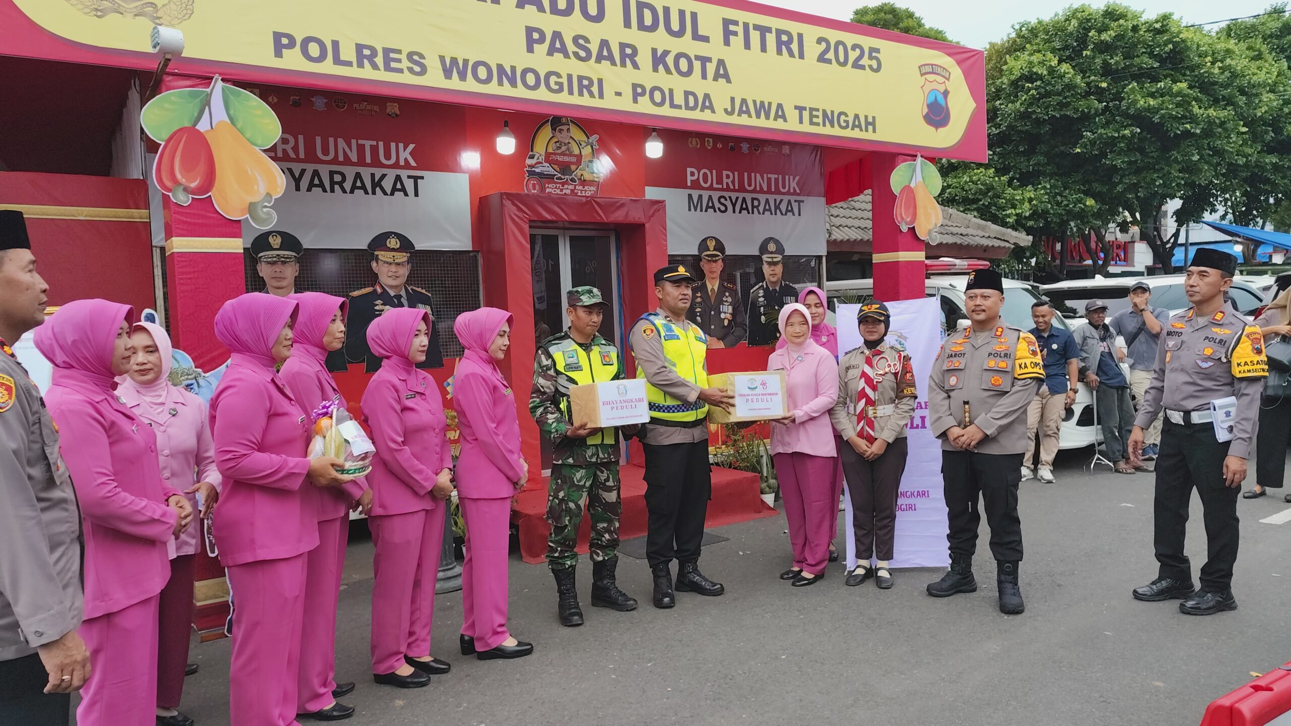 Wonogiri – Wujud Nyata dukungan kepada personel pengamanan Mudik Lebaran tahun 2025 di Kabupaten Wonogiri, Ketua Bhayangkari Cabang Wonogiri Ny Melly Jarot, bersama jajaran pengurus Bhayangkari Cabang Wonogiri, mengunjungi Pos Terpadu Idul Fitri 2025 di pasar kota Wonogiri, Kamis (27/3/2025).