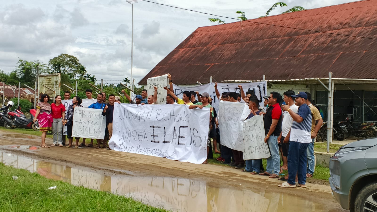 “Penuhi janji kalian PND (PT. Propernas Nusa Dua) kepada kami. Jangan bohongi warga Elais. Segera pasang saluran PAM. Kami butuh bronjong dipinggir sungai. Di perumahan banyak maling dan PND pembohong,” tulis warga dalam spanduk seraya berharap pimpinan developer menemui mereka.