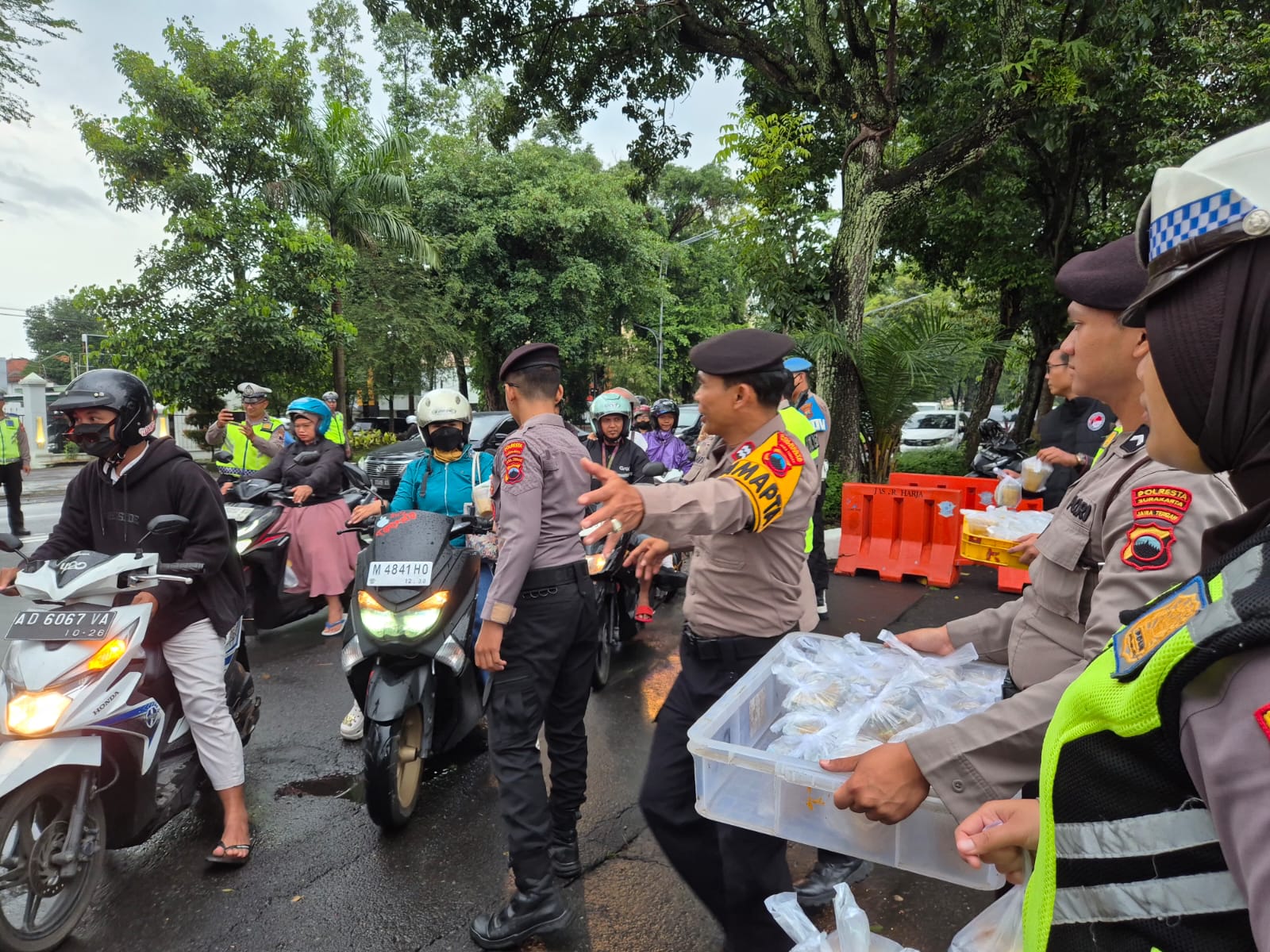 Kegiatan ini menjadi wujud nyata kepedulian Polri terhadap masyarakat yang masih beraktivitas saat waktu berbuka semakin dekat. Dengan senyum dan sapaan ramah, para personel menyodorkan paket takjil kepada pengendara roda dua, roda empat, hingga pejalan kaki yang melintas.