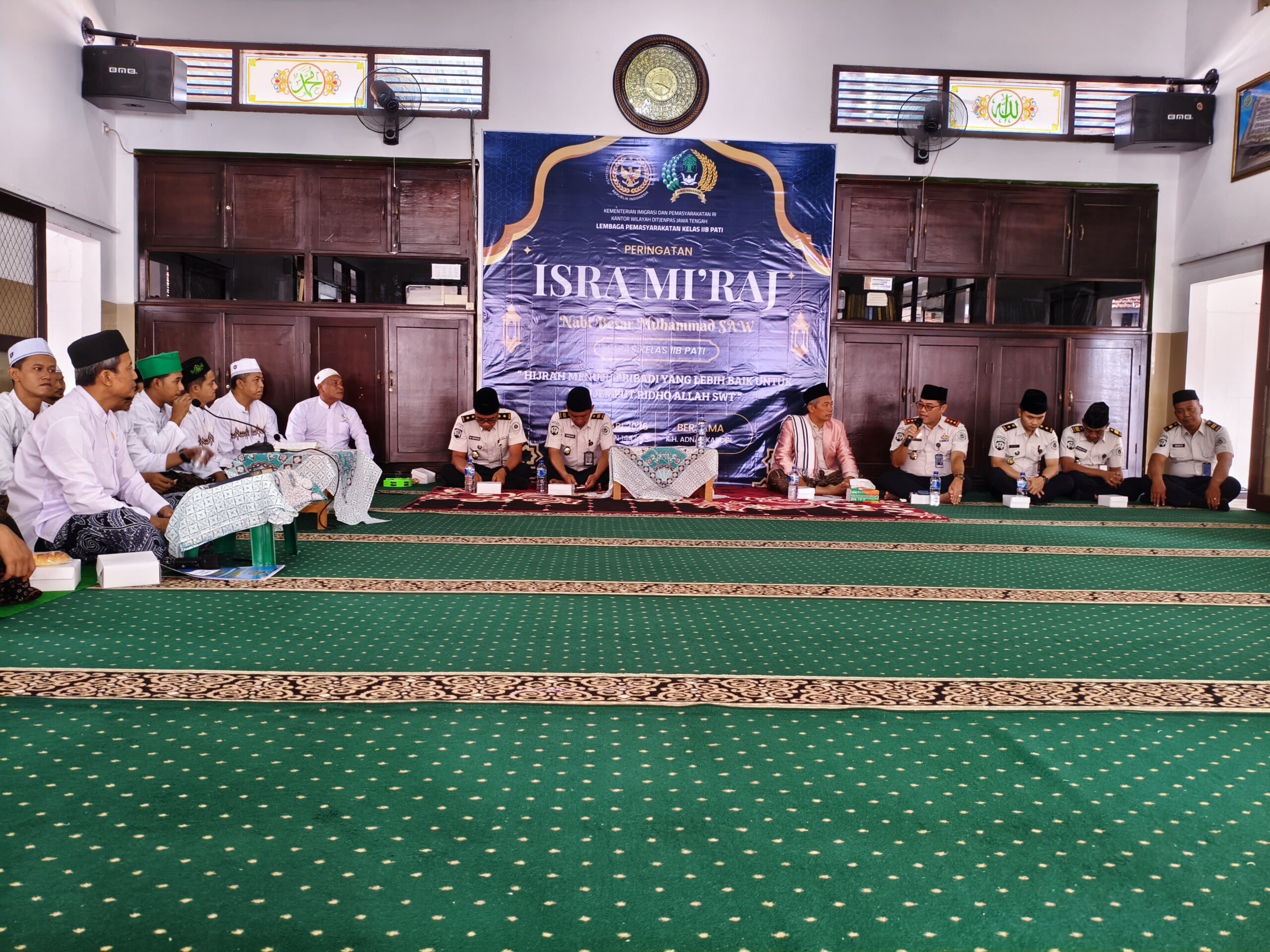 Lapas Pati – Kegiatan peringatan Isra Mikraj Nabi Muhammad SAW digelar dengan khidmat pada hari selasa (20/1) di Lembaga Pemasyarakatan (Lapas) PatiAcara tersebut dihadiri langsung oleh Kepala Lapas Pati beserta para pejabat struktural, penceramah Kyai Adnan Kasogi, serta seluruh Warga Binaan Pemasyarakatan (WBP). Peringatan Isra Mikraj tahun ini mengusung tema *“Hijrah Lebih Baik untuk Mendapat Ridho Allah SWT”*, sebagai momentum refleksi dan pembinaan spiritual bagi seluruh warga lapas.