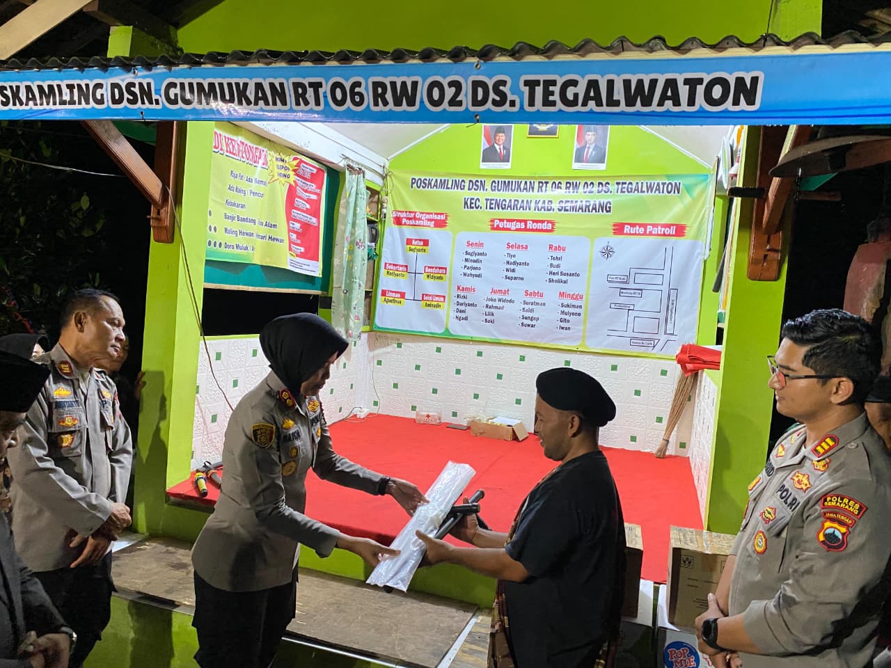 Selanjutnya AKBP Ratna memberikan bantuan peralatan Satkamling, sebagai sarana pendukung bagi warga yang melaksanakan jaga mengamankan lingkungan Ds. Tegalwaton Kec. Tengaran.