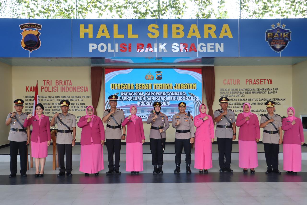 Sragen, Jawa Tengah – Kapolres Sragen AKBP Dewiana Syamsu Indyasari memimpin langsung Upacara Serah Terima Jabatan (Sertijab) sejumlah jabatan strategis di lingkungan Polres Sragen, meliputi Kabag SDM serta tiga jabatan Kapolsek jajaran, yang digelar khidmat di Hall Sibara Mapolres Sragen.