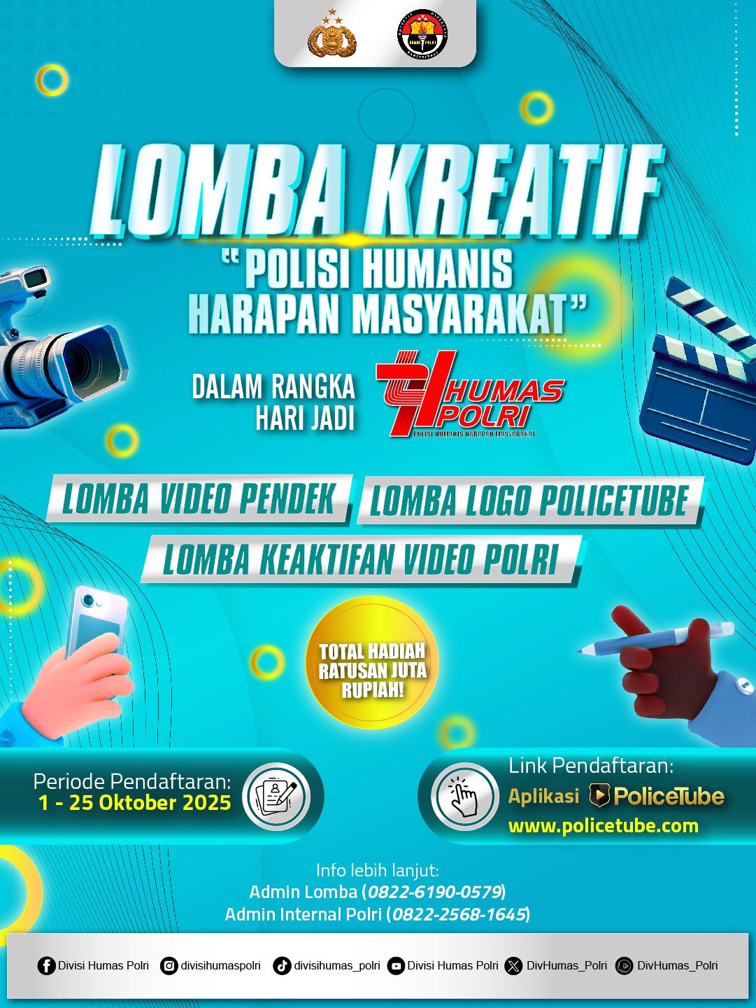 3. Lomba Keaktifan Video Polri – khusus internal anggota Polri, dengan penilaian pada kreativitas, orisinalitas, dan etika penyampaian pesan publik di platform PoliceTube.