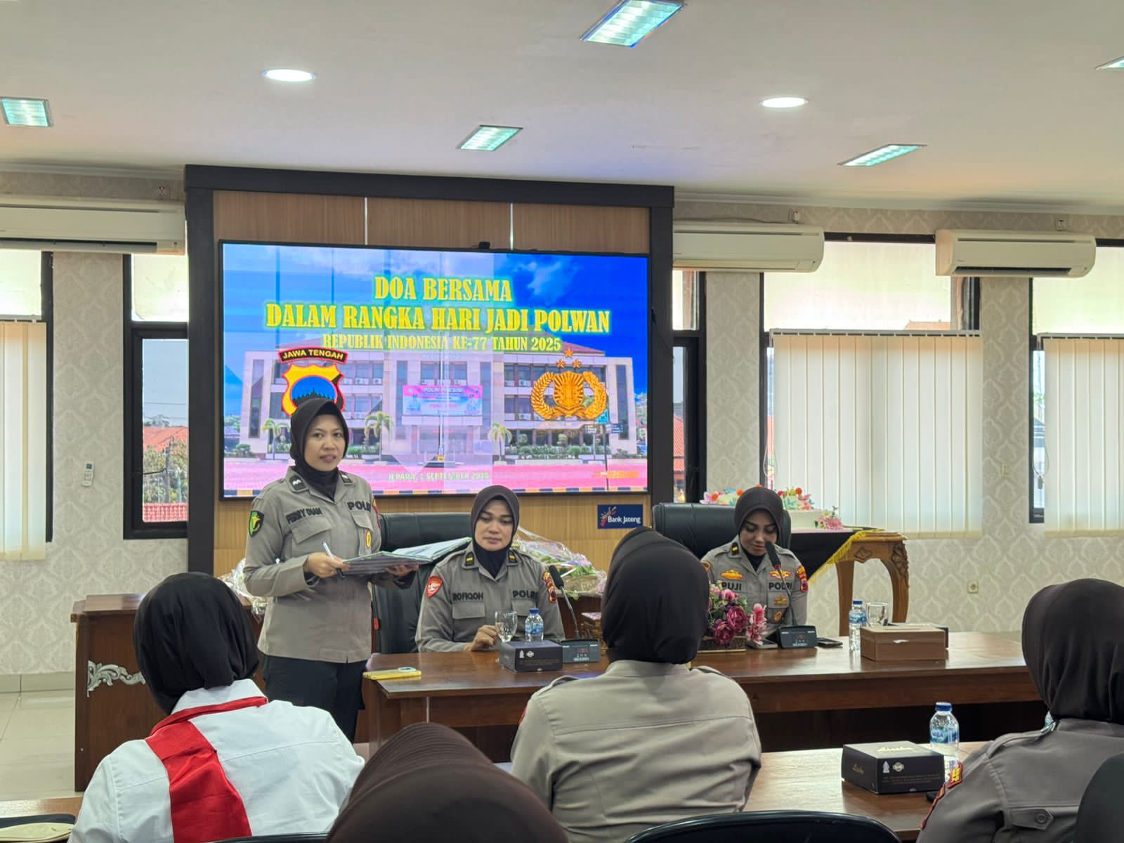 Jepara – Polres Jepara | Suasana khidmat dan penuh kekeluargaan mewarnai kegiatan Doa Bersama dalam rangka Hari Jadi Polisi Wanita (Polwan) Republik Indonesia ke-77 yang digelar oleh Kepolisian Resor (Polres) Jepara, Polda Jawa Tengah.