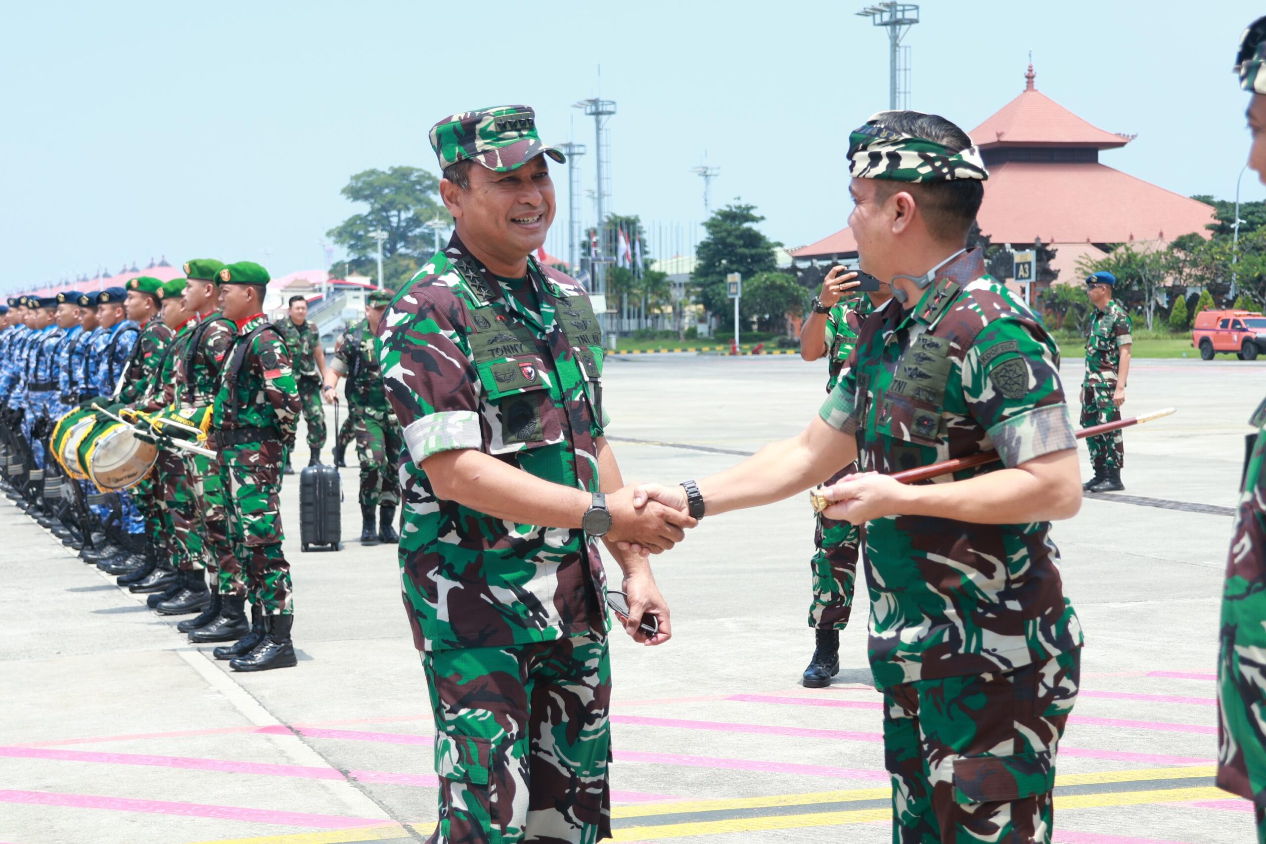 Bali – Penkoopsud II. Panglima Komando Operasi Udara II (Pangkoopsud II) Marsekal Muda TNI Deni Hasoloan S., didampingi Komandan Lanud I Gusti Ngurah Rai Kolonel Pnb Trinanda Hasan F., S.T., M.Han., menyambut kedatangan Kepala Staf Angkatan Udara (Kasau) Marsekal TNI M. Tonny Harjono, S.E., M.M., beserta rombongan di Apron Base Ops Lanud I Gusti Ngurah Rai, Bali, Sabtu (15/2/2025).