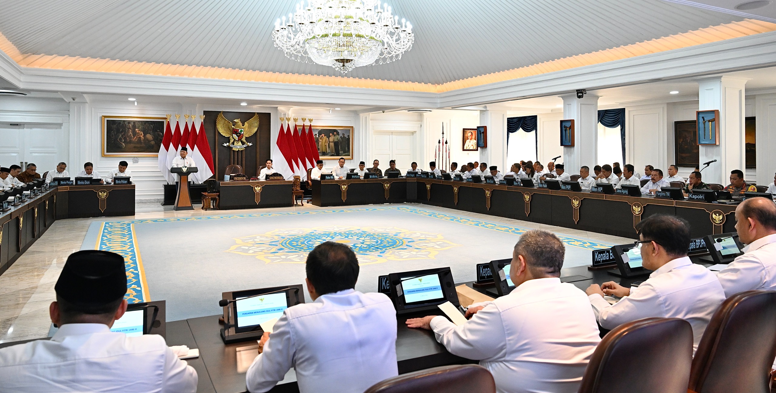 Jakarta – (Puspen TNI). Panglima TNI Jenderal TNI Agus Subiyanto menghadiri Sidang Kabinet Paripurna yang dipimpin Presiden RI Prabowo Subianto di Istana Kepresidenan, Jakarta, Jumat (21/3/2025). Sidang ini membahas strategi menghadapi Idul Fitri 1446 H serta evaluasi 150 hari kinerja Kabinet Merah Putih.