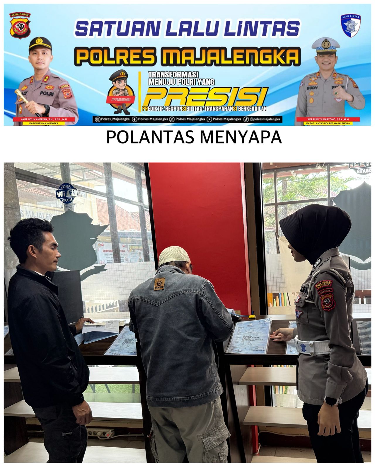 Majalengka – Program Polantas Menyapa terus digencarkan Satlantas Polres Majalengka sebagai wujud pelayanan publik yang humanis dan transparan. Bertempat di Satpas SIM Polres Majalengka, petugas mengedepankan prinsip Senyum, Sapa, Salam (3S) kepada setiap pemohon yang datang untuk membuat maupun memperpanjang SIM, Selasa 25 Nopember 2025.