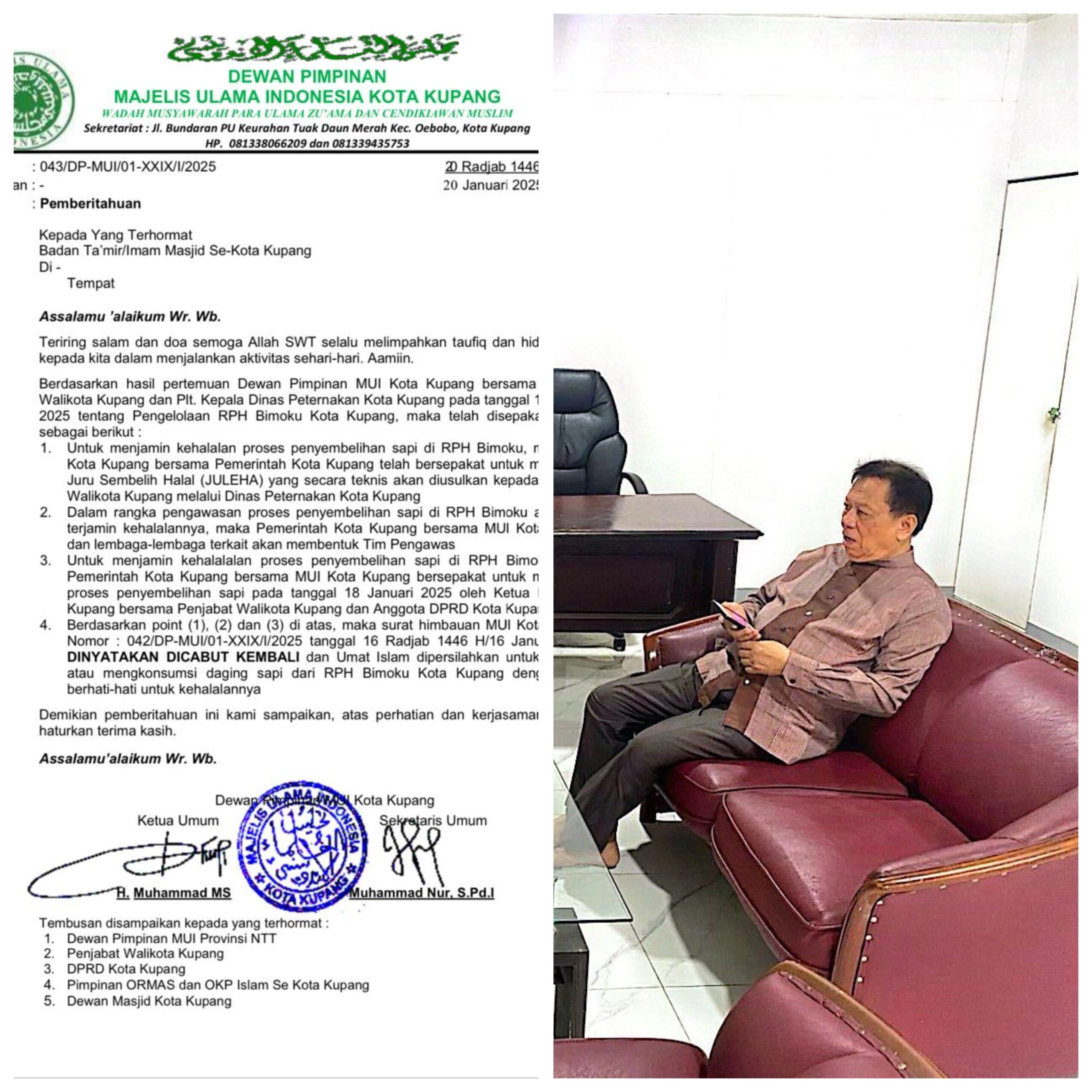 Edaran tersebut berisikan himbauan kepada badan Takmil/Imam Masjid se-Kota Kupang agar sementara waktu tidak membeli atau mengkonsumsi daging sapi dari RPH Bimoku Kupang karena tidak dijamin kehalalannya.