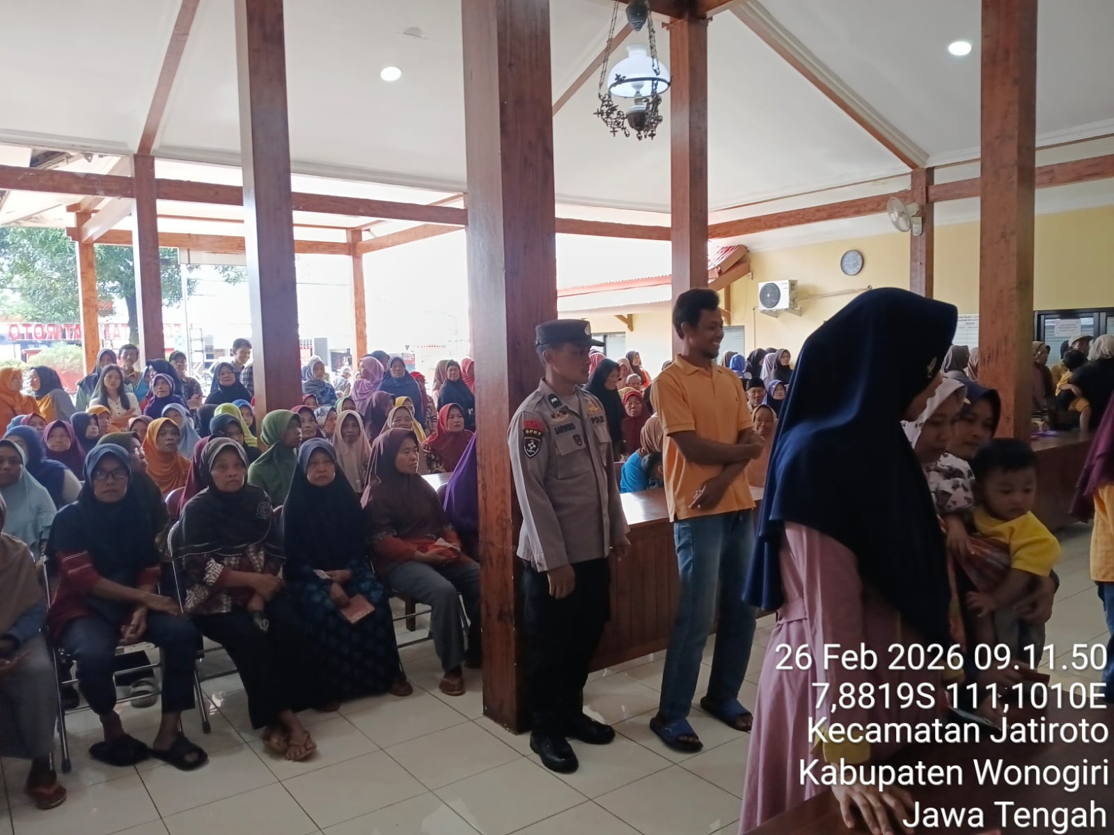 WONOGIRI – Pemerintah menyalurkan Bantuan Langsung Tunai Sementara (BLTS) Kesra Tahun 2025 kepada 1.090 Keluarga Penerima Manfaat (KPM) di Kecamatan Jatiroto, Kabupaten Wonogiri. Kegiatan penyaluran berlangsung pada Kamis (26/2/2026) pagi di Pendopo Rumah Dinas Camat Jatiroto dan berjalan aman serta tertib dengan pengamanan jajaran kepolisian.