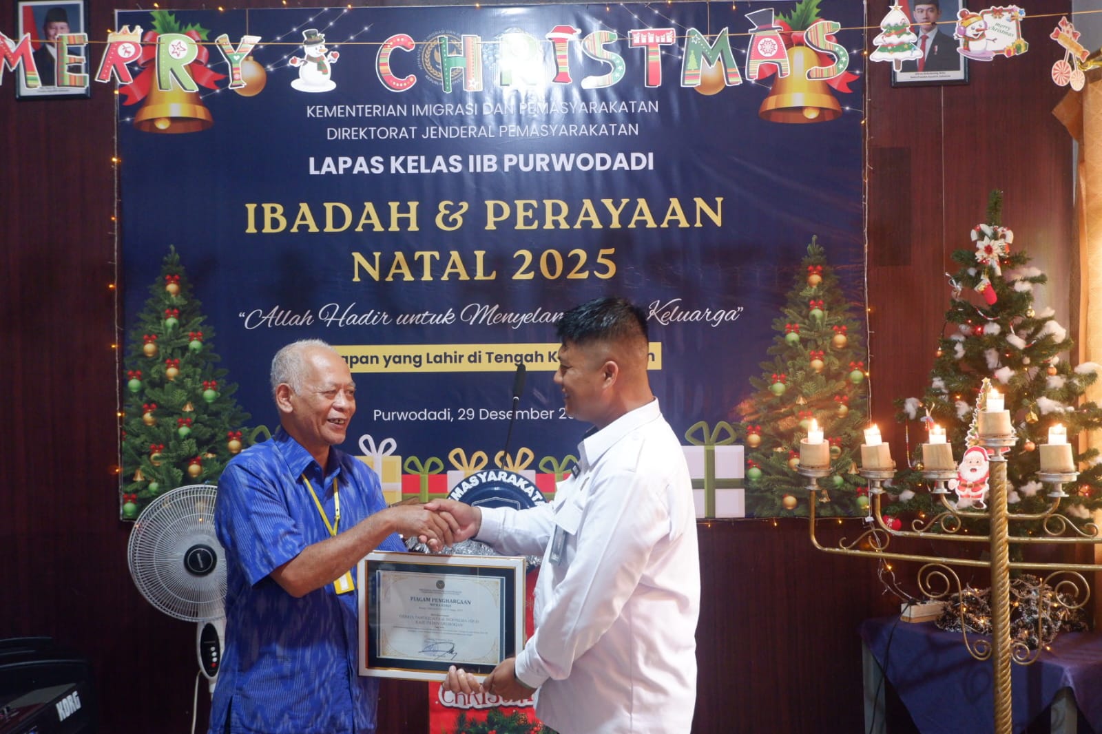 Lapas Kelas IIB Purwodadi – Lembaga Pemasyarakatan (Lapas) Kelas IIB Purwodadi menggelar Perayaan Natal bersama Warga Binaan Pemasyarakatan (WBP) Nasrani pada Senin, 29 Desember 2025. Bertempat di Ruang Birawa, kegiatan berlangsung dengan khidmat dan penuh makna sebagai wujud pembinaan kepribadian serta pemenuhan hak beribadah bagi WBP.