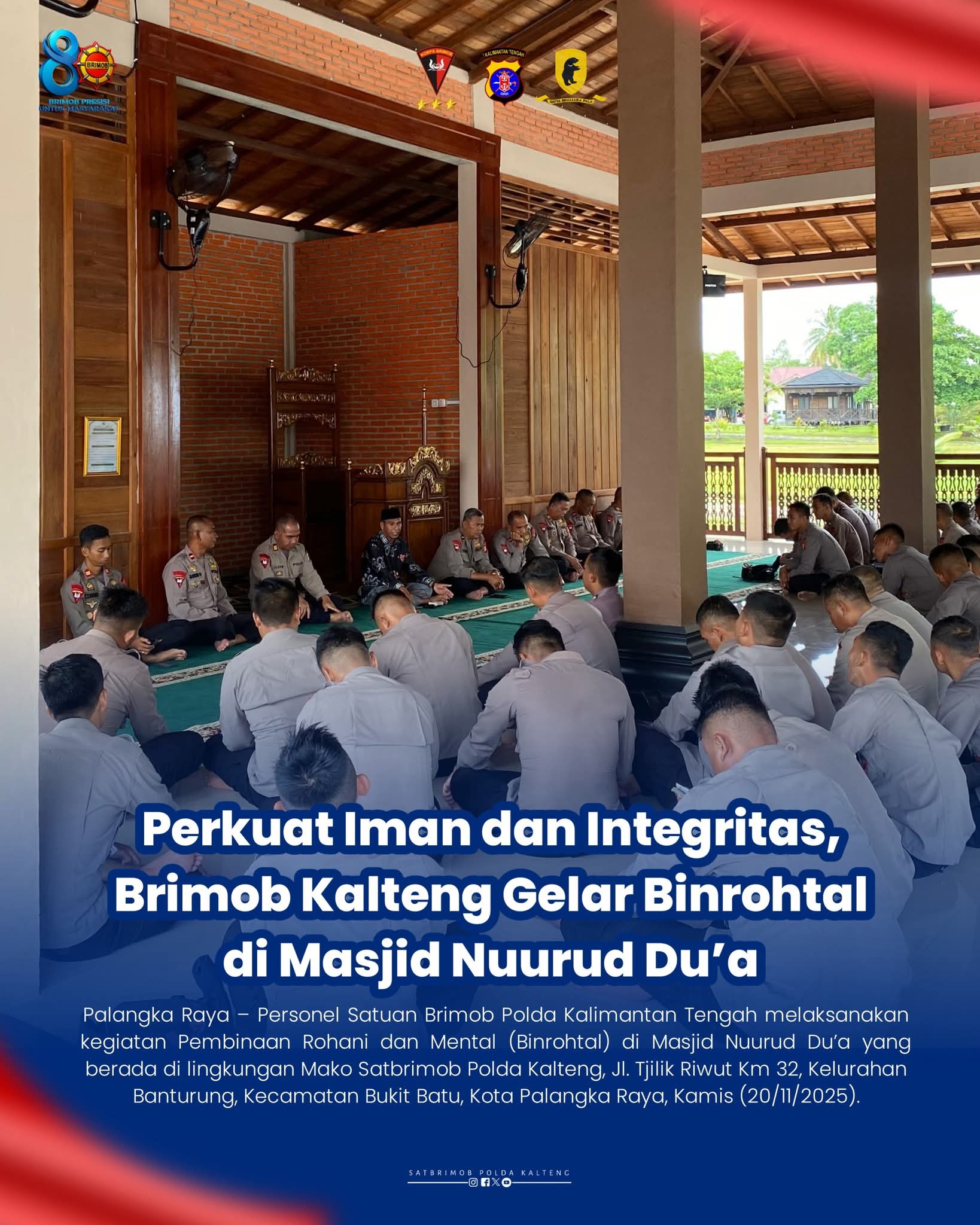 Palangka Raya – Personel Satuan Brimob Polda Kalimantan Tengah melaksanakan kegiatan Pembinaan Rohani dan Mental (Binrohtal) di Masjid Nuurud Du’a yang berada di lingkungan Mako Satbrimob Polda Kalteng, Jl. Tjilik Riwut Km 32, Kelurahan Banturung, Kecamatan Bukit Batu, Kota Palangka Raya, Kamis (20/11/2025).