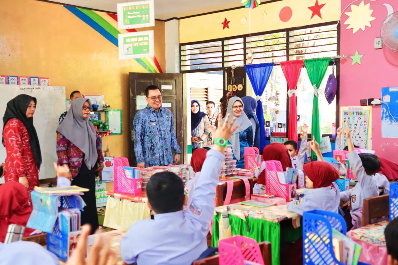 Pj. BUPATI Wajo, ANDI BATARALIFU memasuki Ruang Kelas, Sambil mengajak Siswa SD berbincang bincang dan melihat Pembagian Makanan Gratis di dalam Kelas.