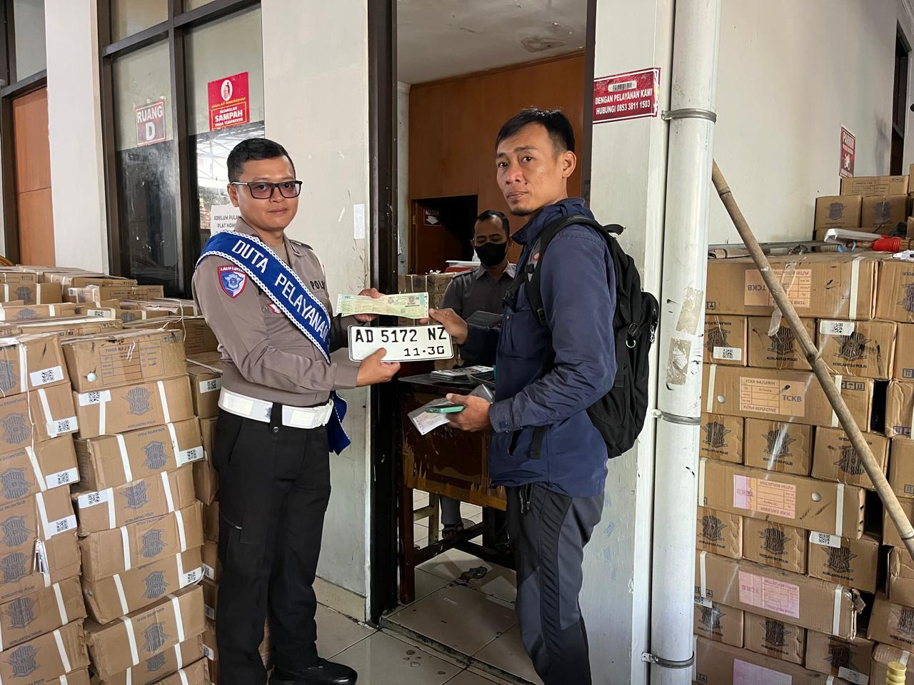 Petugas turut mendampingi proses cek fisik kendaraan, verifikasi data, hingga penyerahan plat nomor kendaraan yang baru kepada pemilik kendaraan. Pendampingan ini dilakukan untuk memastikan pelayanan berjalan tertib, transparan, dan sesuai prosedur yang berlaku.
