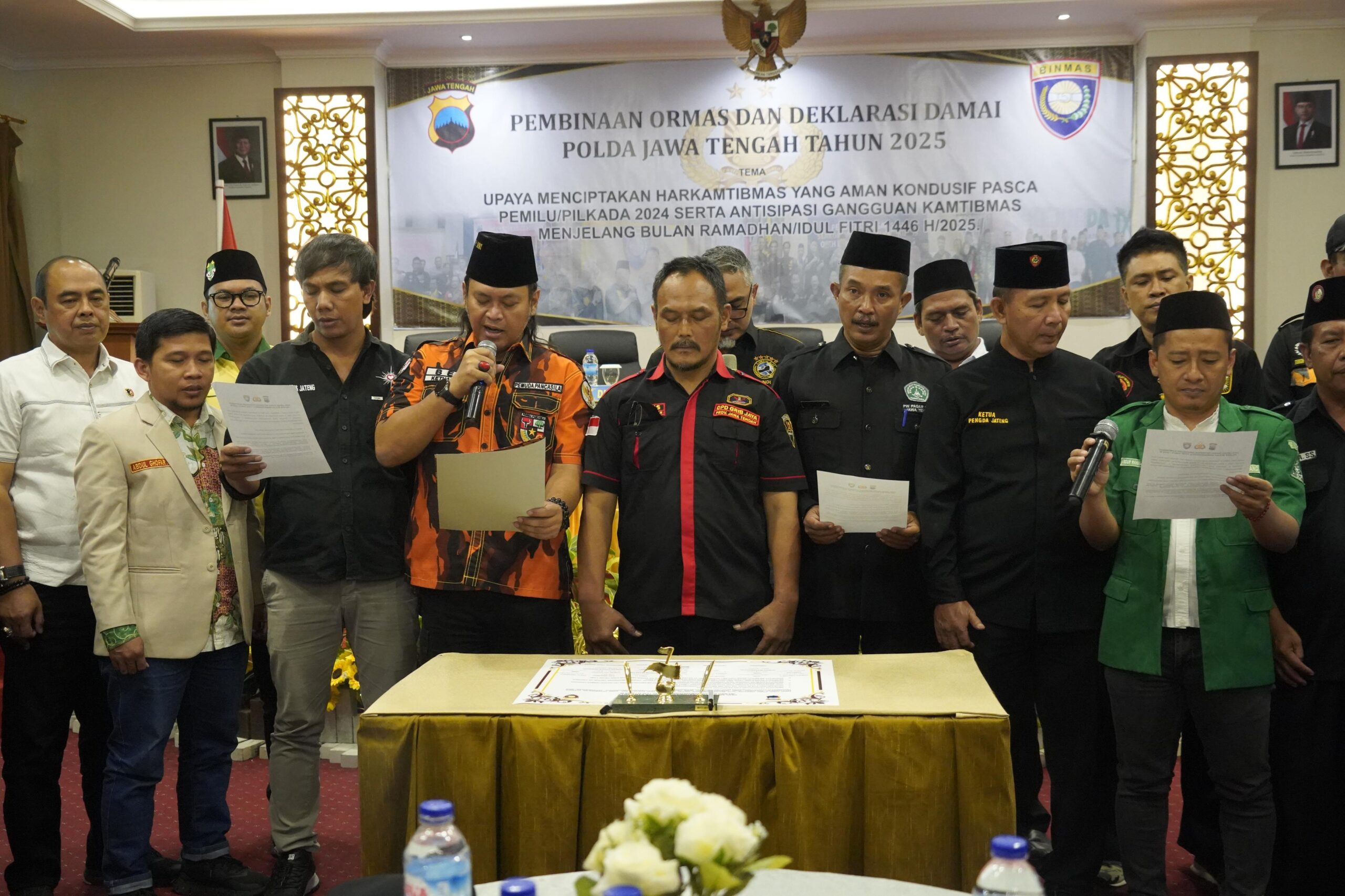 Sebagai bentuk komitmen bersama, kegiatan ini ditandai dengan ikrar dan penandatanganan Deklarasi Damai oleh para ketua dan pengurus ormas. Deklarasi ini memuat enam poin utama, di antaranya menjaga persatuan dan kesatuan bangsa, mendukung TNI-Polri dalam menjaga keamanan di wilayah, menjaga toleransi dan kerukunan antarumat beragama, serta kesanggupan untuk menghindari konflik dengan mengutamakan upaya penyelesaian melalui musyawarah. Sebanyak 19 ketua dan pengurus ormas dari seluruh kota dan kabupaten di Jawa Tengah turut menandatangani deklarasi ini, termasuk Pemuda Pancasila, GRIB, Pagar Nusa, PSHT, Kerasakti, Lindu Aji, FKSB, Senkom Mitra Polri, dan sejumlah ormas keagamaan lainnya.