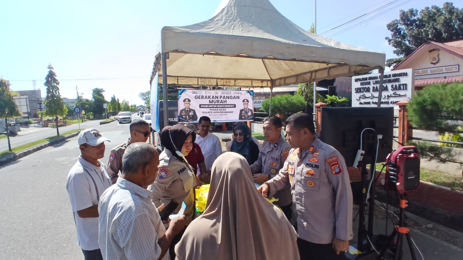 Kegiatan tersebut dilaksanakan pada Jumat (13/3/2026) sekitar pukul 09.00 WIB di depan Mapolsek Banda Sakti, Kecamatan Banda Sakti, Kota Lhokseumawe. Program ini mendapat antusiasme masyarakat yang datang untuk mendapatkan kebutuhan pokok dengan harga lebih terjangkau.
