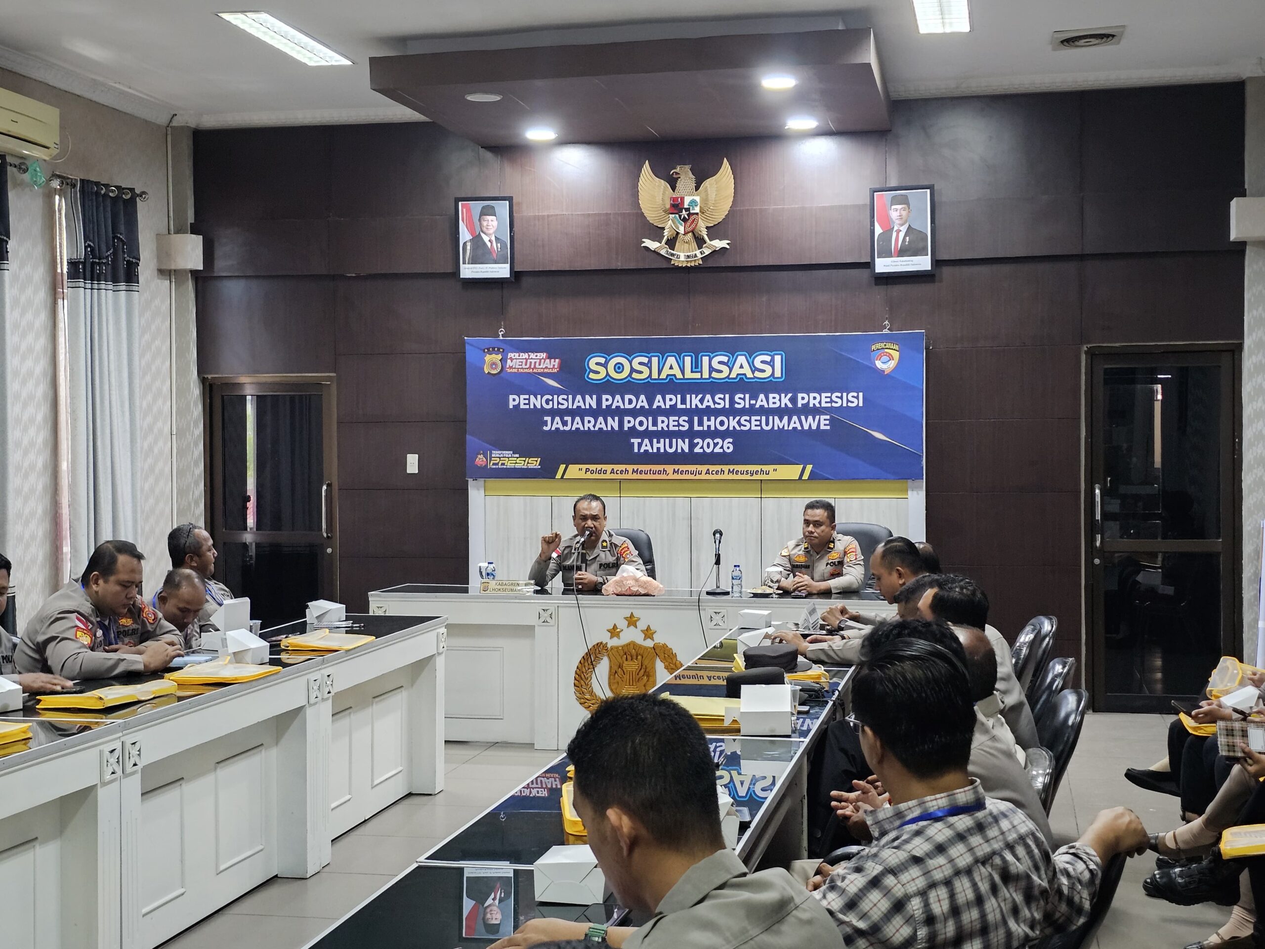 LHOKSEUMAWE ( DERAP KEADILAN.COM ) – Polres Lhokseumawe menggelar kegiatan Sosialisasi Pengisian Aplikasi SI-ABK PRESISI bagi jajaran Polres Lhokseumawe Tahun 2026. Kegiatan tersebut berlangsung di Aula Vidcon Presisi Polres Lhokseumawe, Kamis (22/1/2026), pagi.