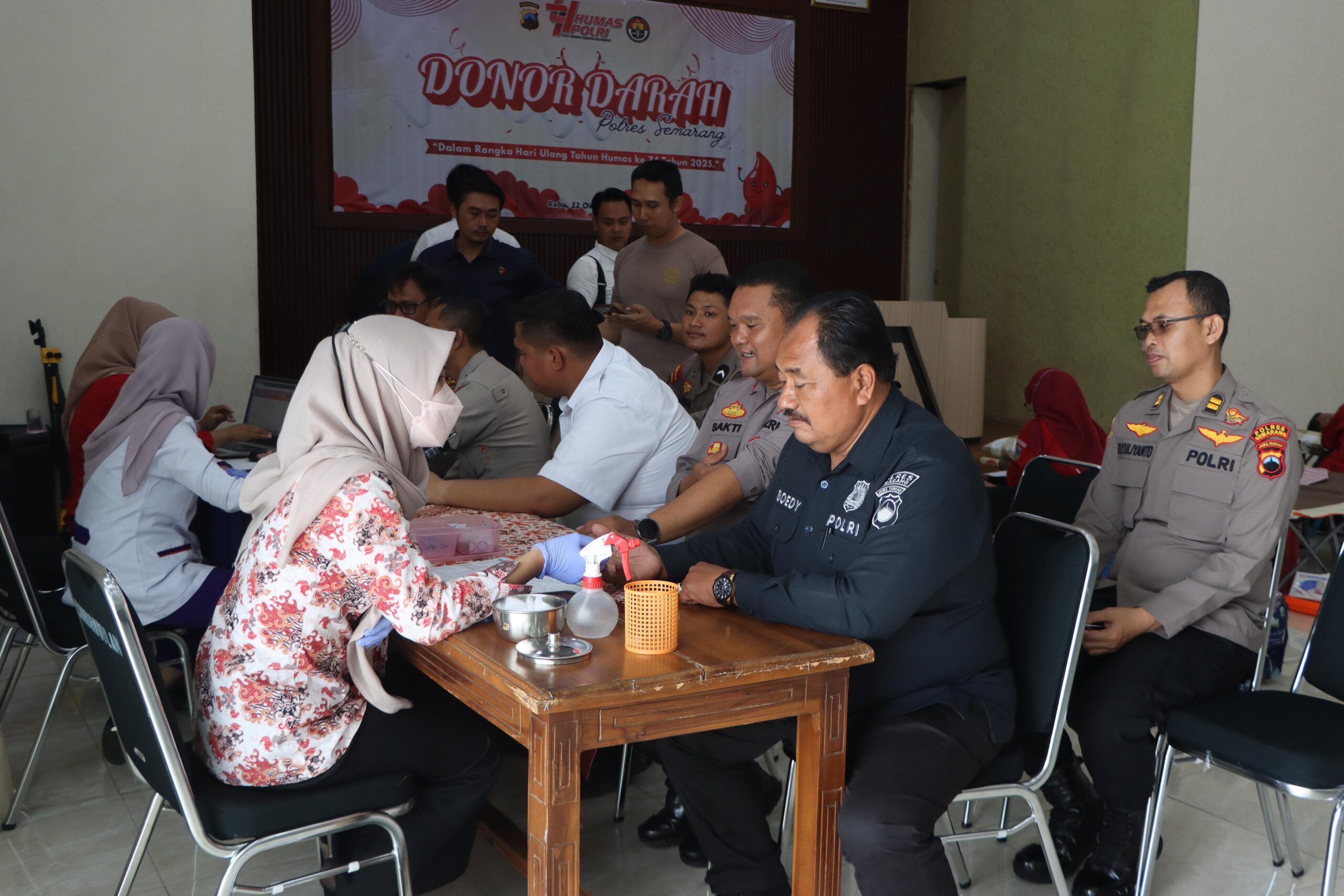 Polres Semarang_Polda Jareng – Dalam rangka memperingati Hari Ulang Tahun Humas Polri ke-74, Polres Semarang menggelar kegiatan donor darah pada Selasa, 22 Oktober 2025 pukul 09.00 WIB bertempat di Aula Condrowulan Polres Semarang. Kegiatan sosial kemanusiaan ini dilaksanakan berkolaboraso dengan Si Dokkes Polres Semarang dan Palang Merah Indonesia (PMI) Kabupaten Semarang.