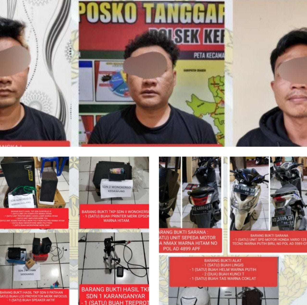 Barang bukti yang berhasil diamankan antara lain CPU komputer, printer Canon, amplifier TOA, serta perangkat audio. Sedangkan dari TKP SDN 3 Guworejo ditemukan dua engsel gembok serta alat berupa linggis dan helm dua unit sepeda motor Honda NMAX dan Vario yang digunakan sebagai sarana pencurian.