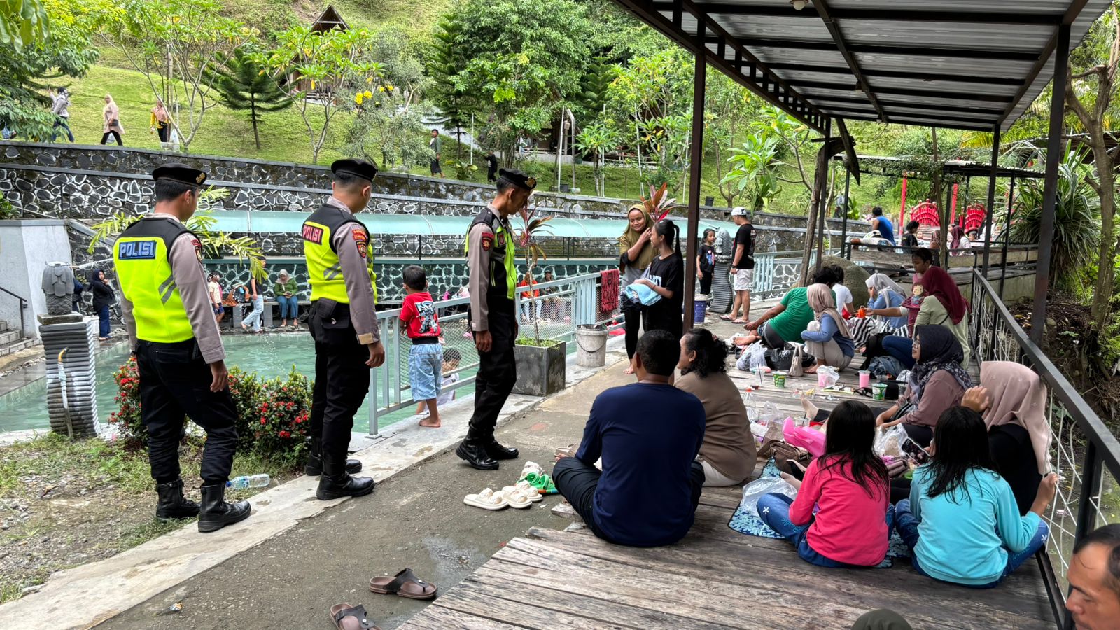 Personel Pamobvit melakukan pemantauan langsung situasi kawasan wisata, menyapa pengunjung, serta memberikan imbauan kamtibmas secara humanis.
