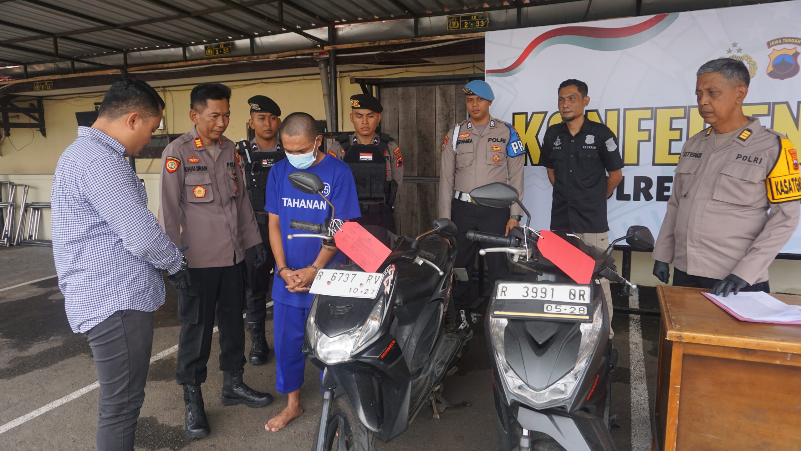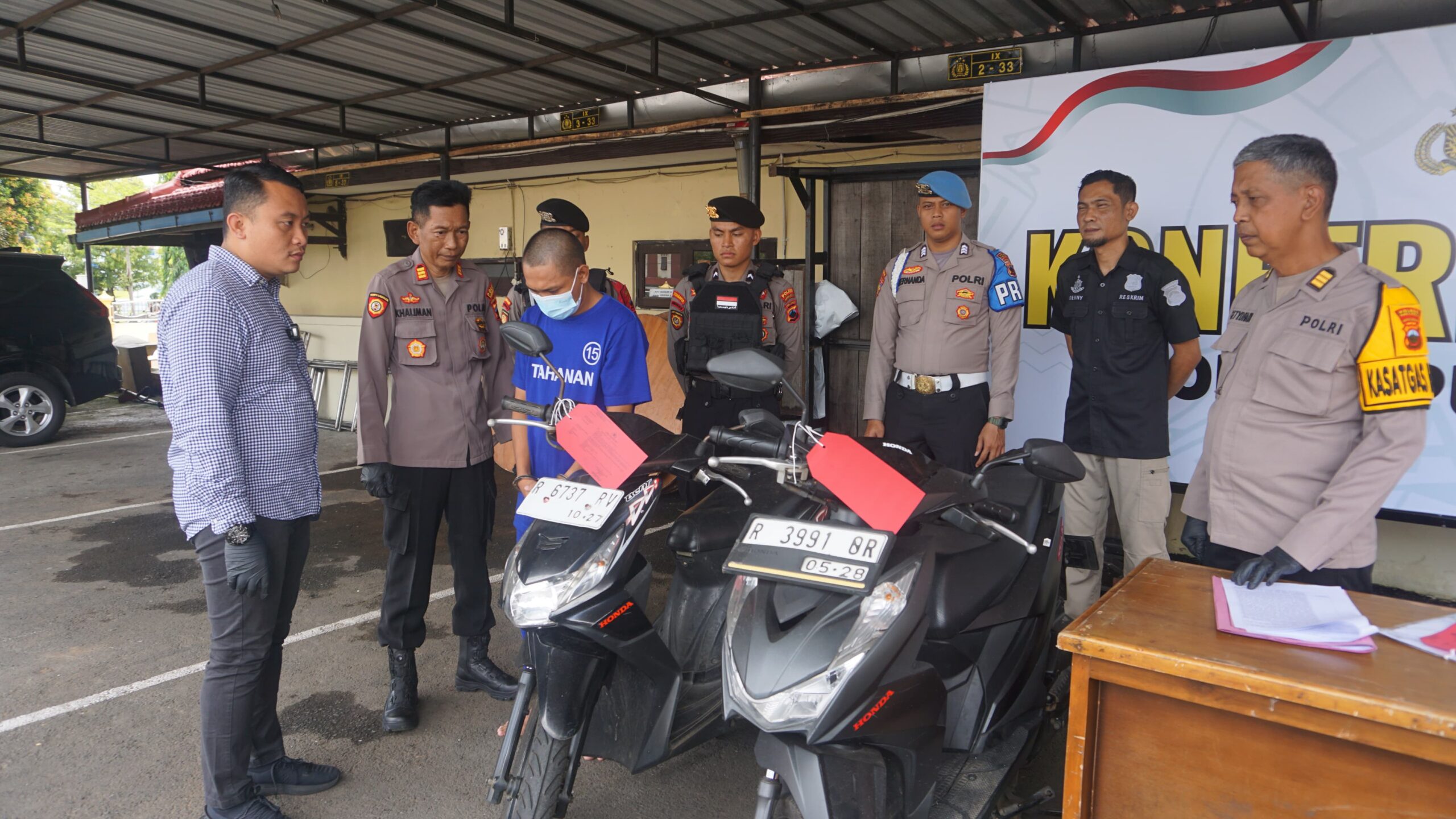 Barang bukti yang diamankan yaitu satu unit sepeda motor Honda Beat warna hitam bernomor polisi R-6737-RV, satu unit sepeda motor Honda Beat warna hitam bernomor polisi R-3992-OR, dua buah STNK sepeda motor tersebut.