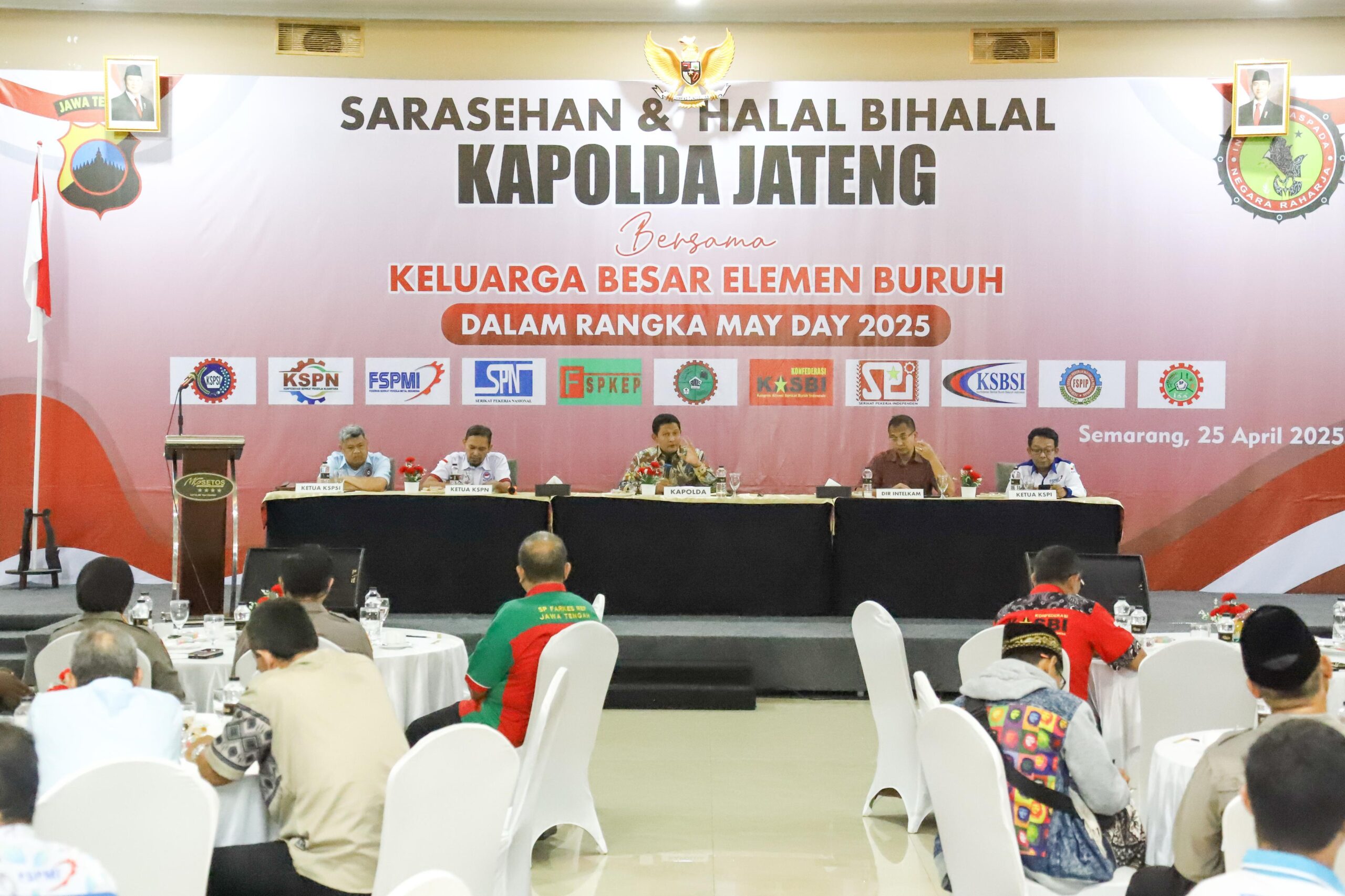 Polda Jateng-Kota Semarang | Menyambut peringatan Hari Buruh Internasional atau May Day 2025, Polda Jawa Tengah menggelar kegiatan sarasehan dan halal bihalal bersama perwakilan serikat buruh/pekerja se-Jawa Tengah. Kegiatan berlangsung pada Jumat, (25/04/2025) pagi, bertempat di Ruang D’ATRIUM Lantai 5 Hotel MG Setos, Kota Semarang.