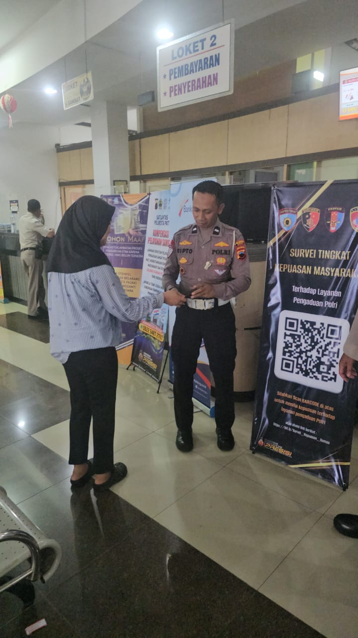 Pati, Jateng – Satlantas Polresta Pati kembali hadir lewat program Polantas Menyapa. Fokus kegiatan ini adalah memberikan edukasi terhadap wajib pajak terkait aplikasi Barcode, untuk pembayaran pajak kendaraan.