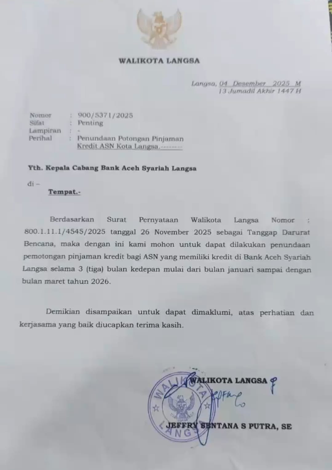 Hal tersebut tertuang dalam surat pernyataan wali kota Langsa nomor 800.1.11.1/4545/2025 tanggal 26 Desember 2025 sebagai tanggap darurat bencana.”kami memohon untuk dapat dilakukan penundaan pemotongan pinjaman kridit bagi ASN yang memiliki kridit di bank Aceh Syariah selama 3 (tiga) bulan kedepan mulai bulan Januari sampai dengan Maret tahun 2026″.
