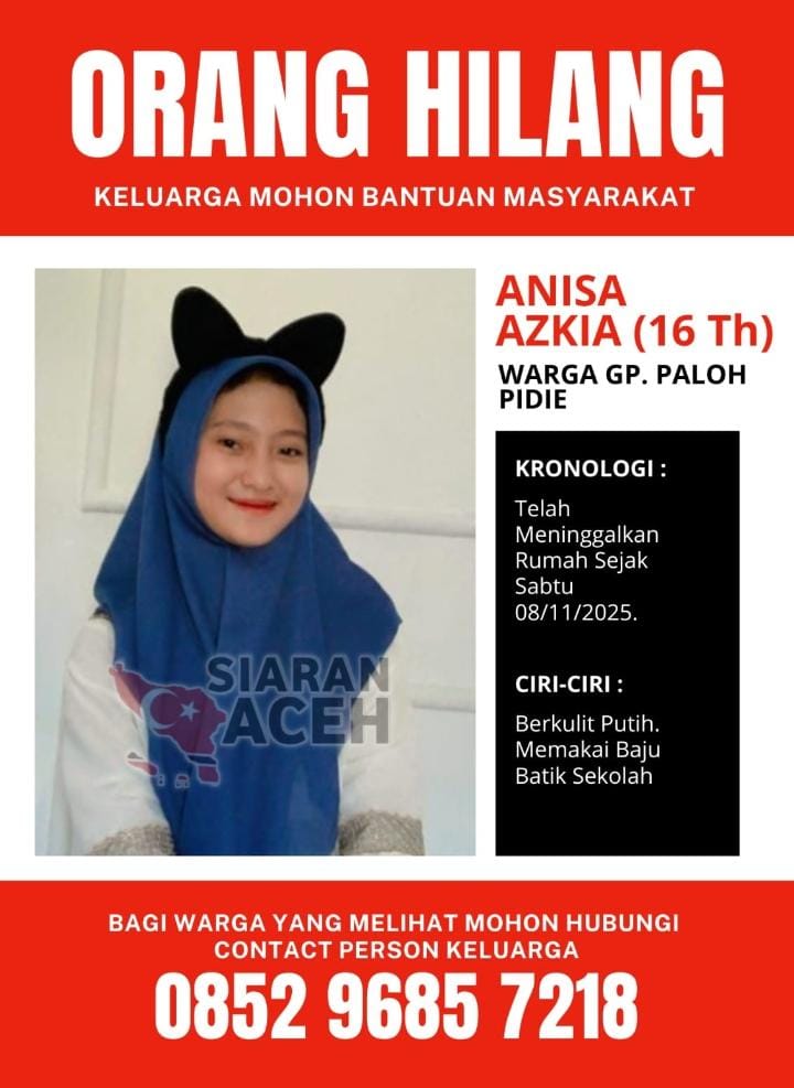 Pidie, Derapkeadilan.com – Masyarakat Pidie dan sekitarnya diimbau untuk membantu mencari Anisa Azkia, seorang remaja putri berusia 16 tahun yang dilaporkan hilang sejak Sabtu, 8 November 2025. Anisa adalah warga Gampong Paloh, Pidie.